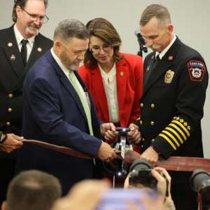 From left: Draper Fire Chief Clint Smith, Utah Fire and Rescue Academy Director Bradley Wardle, Utah Lt. Gov. Deidre Henderson, Lehi Fire Chief Jeremy